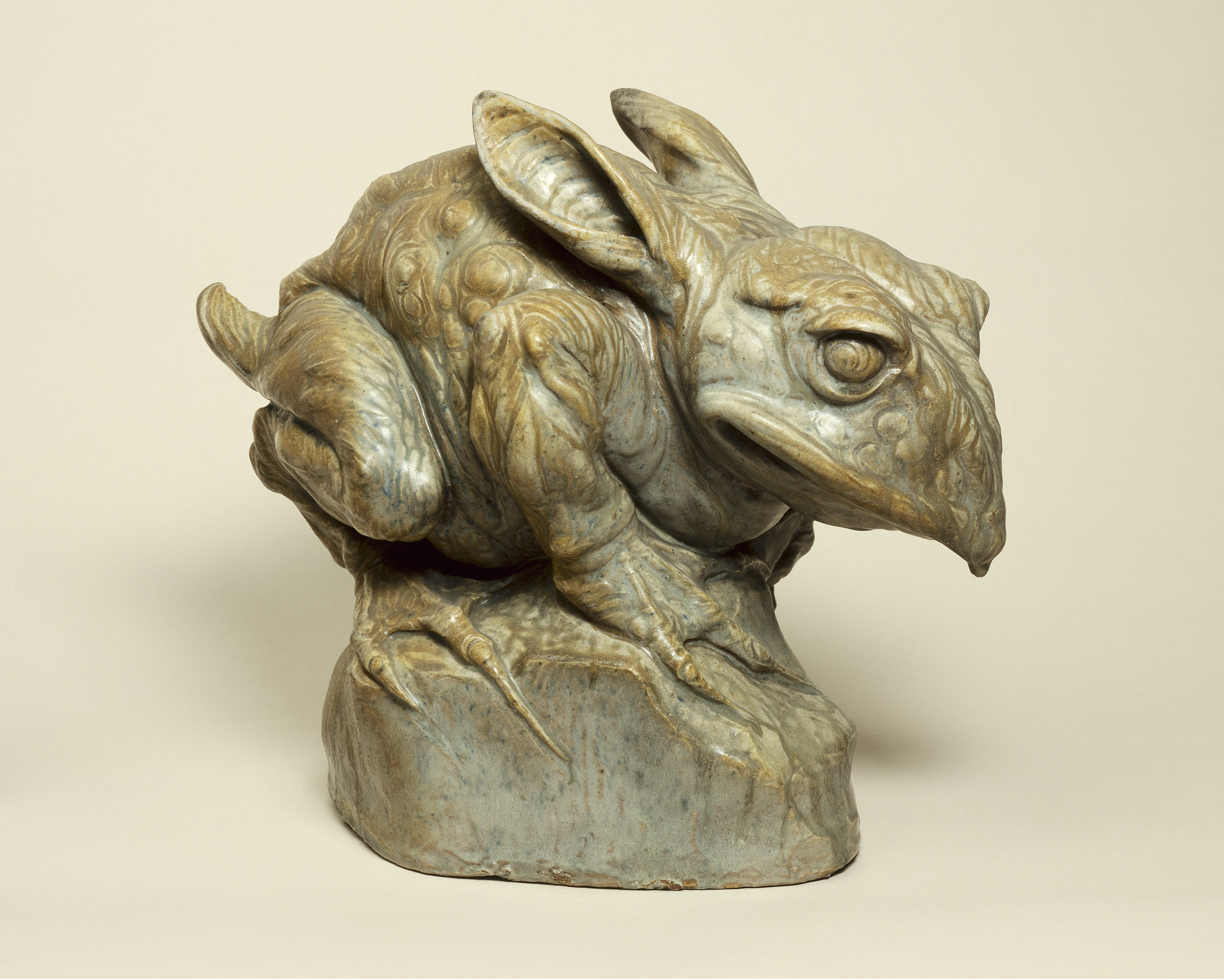 Escultor convertido en ceramista, Jean Carriès (1855-1894), proporciona un testimonio de este nuevo interés de los artistas de finales del siglo XIX por las artes del fuego. La «revelación» del gres llega para el en 1878: descubre la cerámica japonesa en la Exposición Universal. Fascinado por este material al que llama «el macho de la porcelana», se instala en Saint-Amand-en-Puisaye (Nièvre) para aprender el arte de la alfarería. Autodidacta, inventa un bestiario fantástico del que la rana con orejas de conejo representa el ejemplo más famoso. La textura granulosa del gres y sus efectos de patina con múltiples matices le permite restituir lo mejor posible la epidermis del batracio, ya que Carriès utiliza sutilmente «la asociación natural de ideas que el esmalte graso, granuloso o liso, verdoso o pardo, podía evocar con una piel de sapo, caimán o lagarto». Criatura híbrida dotada de patas con garras y pico puntiagudo, la Rana con orejas de conejo provoca repulsión a los visitantes en el Salón, junto con otras quimeras surgidas la imaginación mórbida de Carriès: «¡Estas horribles bestias existen! Pero su maestro escultor es un loco, un morfinómano, un alucinado… ¡Oh! Estos sapos, estas larvas, estos renacuajos, estos arrastramientos, estas pústulas».