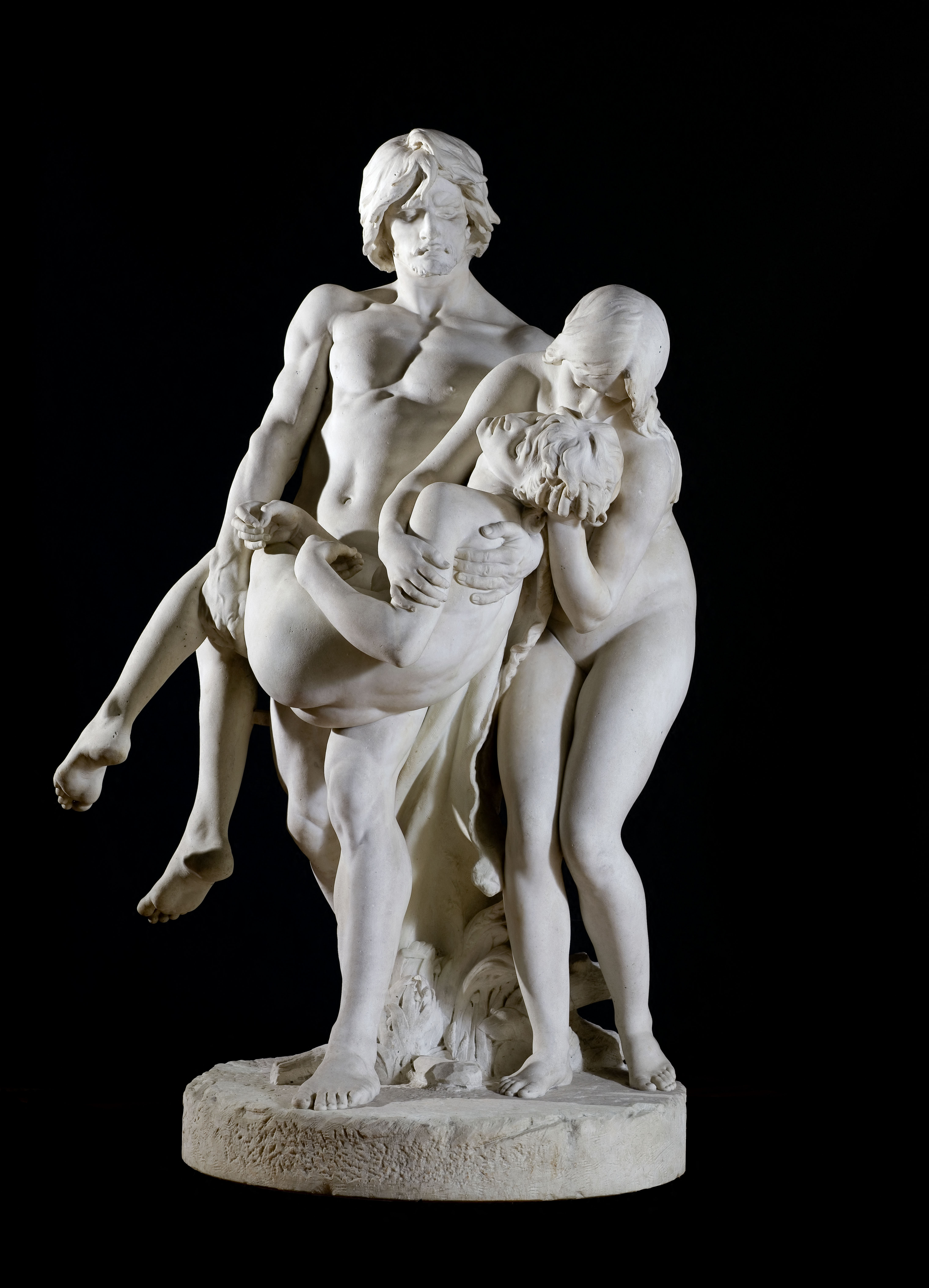 This biblical group shows Adam and Eve carrying their son Abel, victim of his brother Cain's jealousy. The plaster sculpture won a Medal of Honour at the 1878 Salon, where it was considered as the "highest manifestation of the feeling that can be expressed in sculpture". Although displaying formal references to Michelangelo and Bernin, Barrias sets the mourning scene in a fantasy Prehistory evoked by a carved flint. Adam is given a wild-looking face with Gallic features, another allusion to the earliest days of humankind. In contrast, Eve and Abel's body are more reminiscent of Antiquity revisited by the Renaissance.