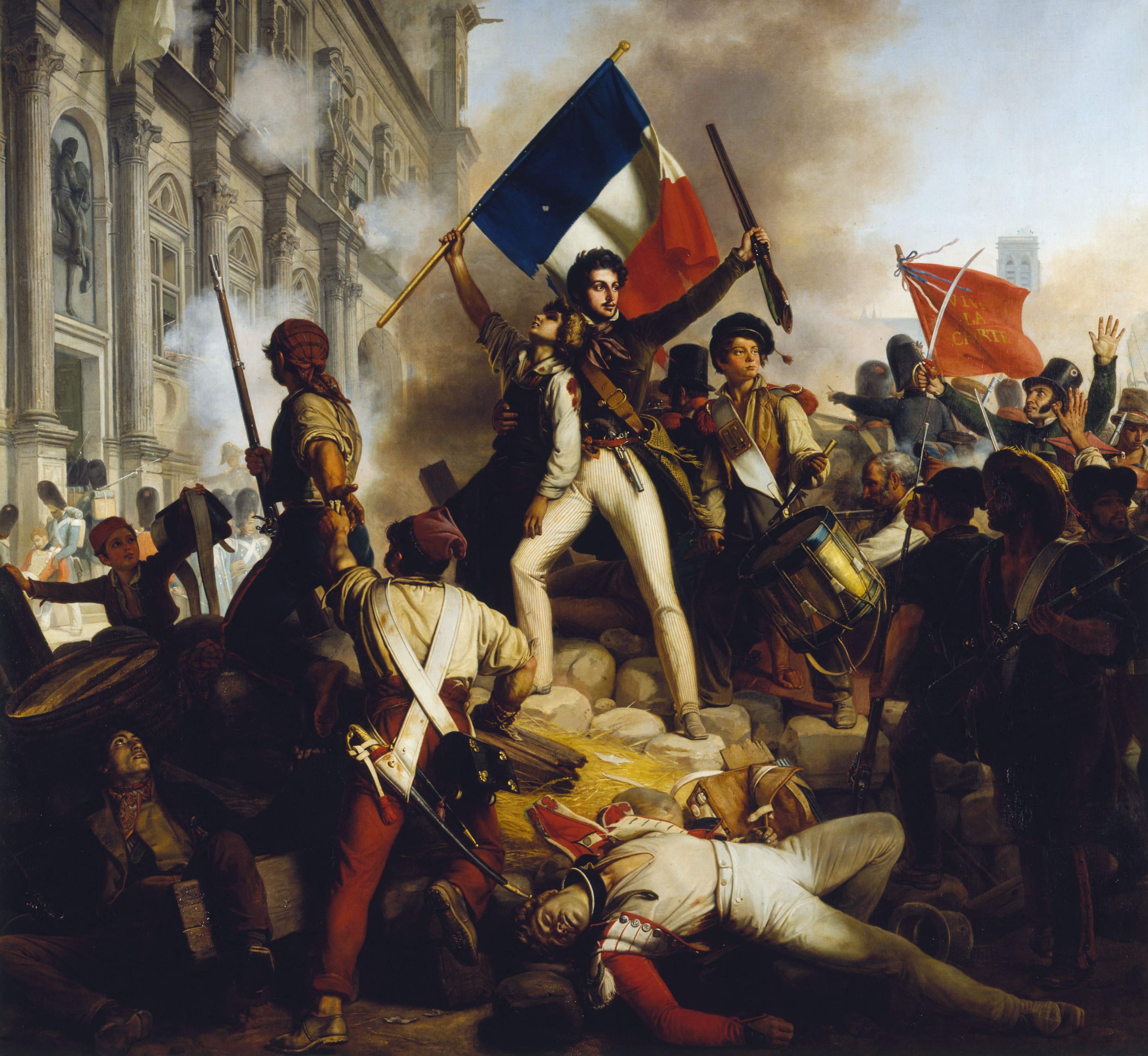 Antiguo alumno de David, Victor Schnetz participa a las principales obras decorativas parisinas bajo Luis Felipe. Es uno de los cuatro pintores encargados de celebrar las grandes revoluciones parisinas, en los muros de la antigua Sala del Trono del Ayuntamiento. Schnetz ilustra el segundo día de las «Tres Gloriosas» de 1830. En reacción contra las ordenanzas liberticidas firmadas por Carlos X, la muchedumbre insurgida erigió barricadas y se amparó del Ayuntamiento. Como La Libertad guiando al Pueblo de Delacroix, la escena se sitúa encima de una barricada. El niño herido que alza la bandera tricolor prefigura el Gavroche de Victor Hugo. Esta decoración no se colocará bajo la Monarquía de Julio. Conservado en almacenes externos, se salvará del incendio del Ayuntamiento en 1871.