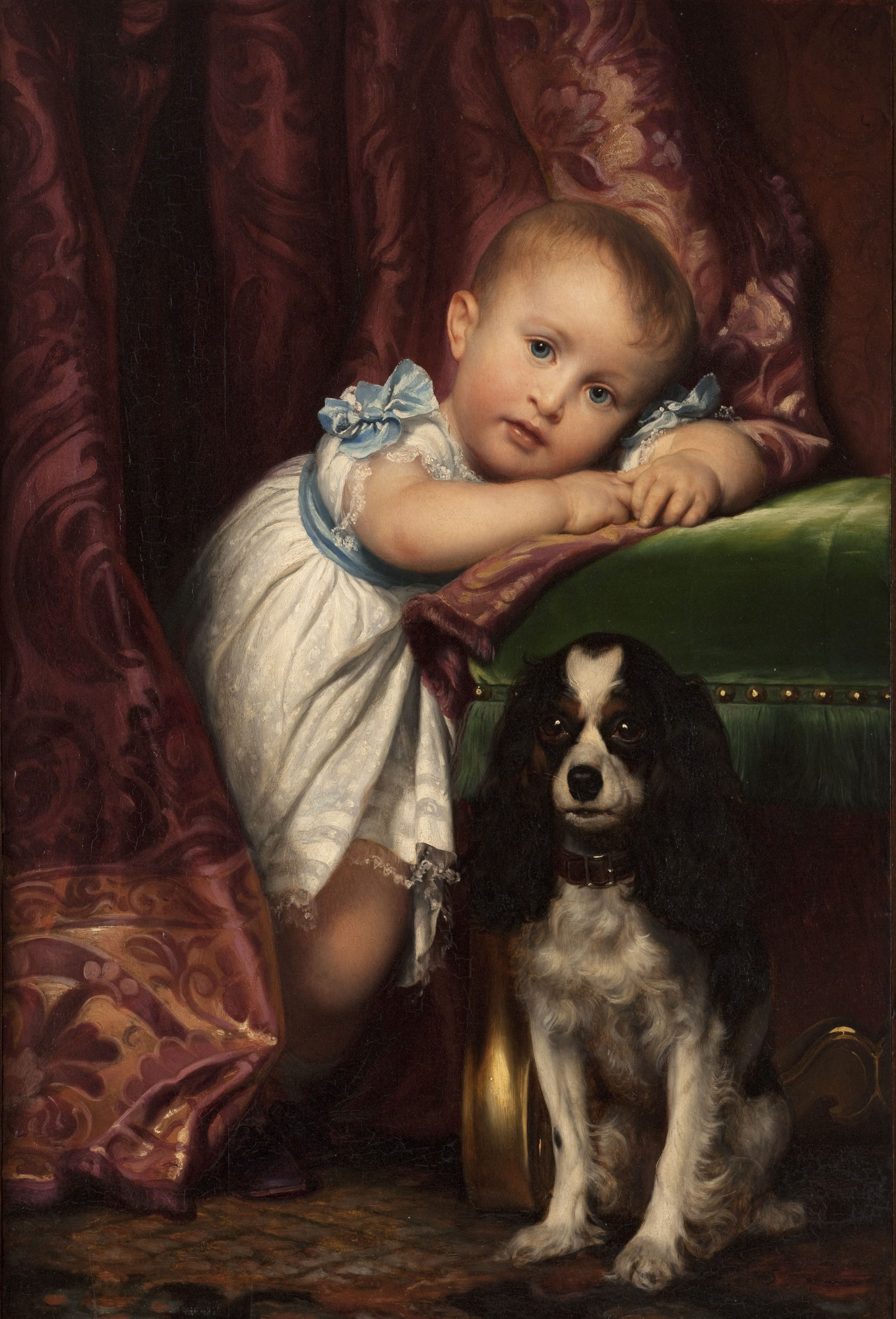 Los lujosos accesorios forman un contraste enternecedor con la candidez del modelo, con un cachorro de raza spaniel que posa tan dócil como su amo. Heredero de una larga dinastía de pintores, el niño es el nieto de Horace Vernet, cuya hija Louise se casó con Paul Delaroche.