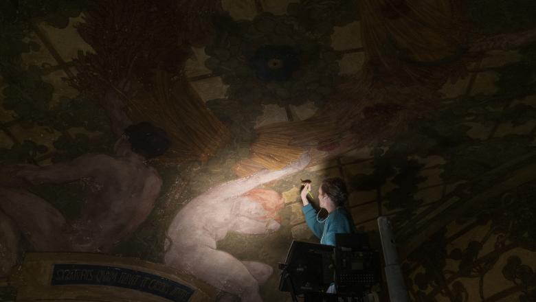 La voûte du péristyle est ornée, sur plus de 1000 m2 et 108 mètres de long, d’une fresque majestueuse, réalisée par le peintre Paul Baudoüin entre 1910 et 1911. Grand admirateur de l’Italie et des fresques de la Renaissance, Baudoüin, élève de Puvis de Chavannes, a redécouvert cette technique ancestrale, alors oubliée. Le décor du Petit Palais illustre le calendrier républicain, à travers une succession de figures poétiques évoquant les saisons, les mois et les heures du jour et de la nuit. Grâce à ce chantier historique pour le Petit Palais, ce chef-d’œuvre monumental retrouvera bientôt toute sa richesse chromatique et son éclat d’origine.