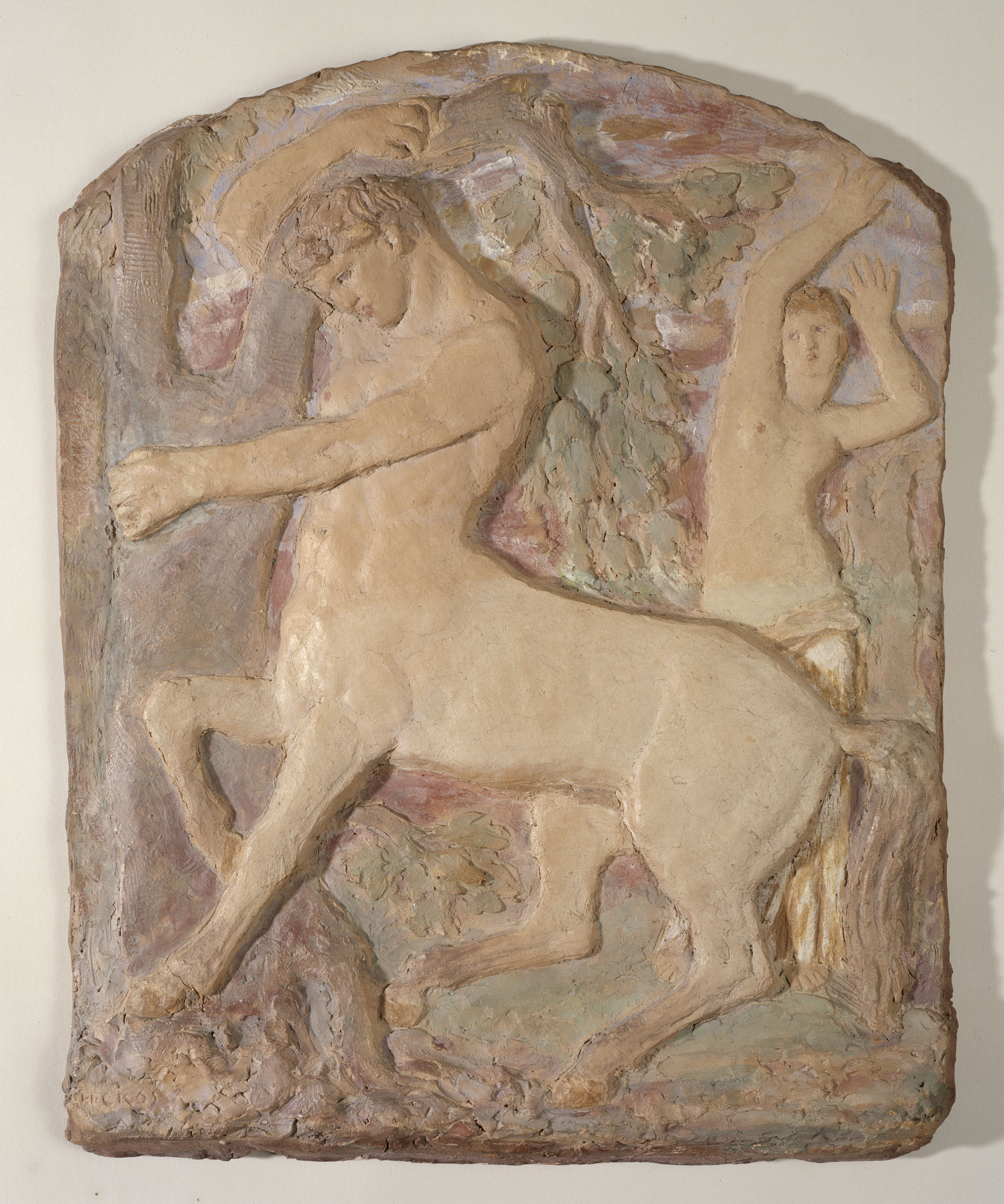 An eclectic and cultured character, in the text Cros revisits the myths and legends of antiquity with a contemporary eye. Here, in a confined space, like a metope at the Parthenon, he depicts a centaur uprooting a tree and a dryad or tree nymph mourning the death of the tree, linked to her own death.