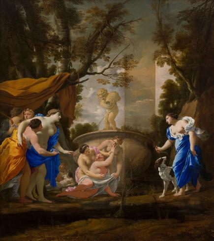 This painting, one of a series of five illustrating scenes from the life of Diana, comprises two parts, with a 17th-century canvas integrated into a larger, later composition.