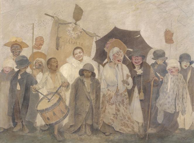 Here Pelez depicts a group of children wearing costumes and face paint. Their over-sized clothing parodies the world of adults by making fun of the bourgeois codes to which these bowler hats and floral bonnets belong. In the right hand section of the painting, the faces are totally hidden behind masks, with distorted mouths highlighted in red. In the centre, there is a smiling Pierrot dressed in white with his face covered in flour. His attitude expresses cheerfulness tinged with irony, in the manner of the figures popularised by Adolphe Willette, one of the artists who was greatly involved in the organisation of the procession.