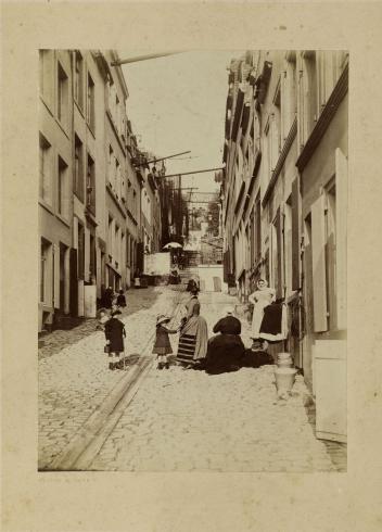 The subject here seems to be as much the artist in front of his subject as actual life in the street and the amused surprise of curious onlookers. Figures in the foreground observe the artist, but also the photographer taking a picture of the scene. The photographer could perhaps be trying to justify the subject that the artist has come to seek in a picturesque spot (possibly Normandy or the banks of the Seine judging by the fishing nets hanging above the artist). A portrait of an artist at work becomes for the photographer an opportunity to produce a spontaneous, unposed image which could not be further from official photography.