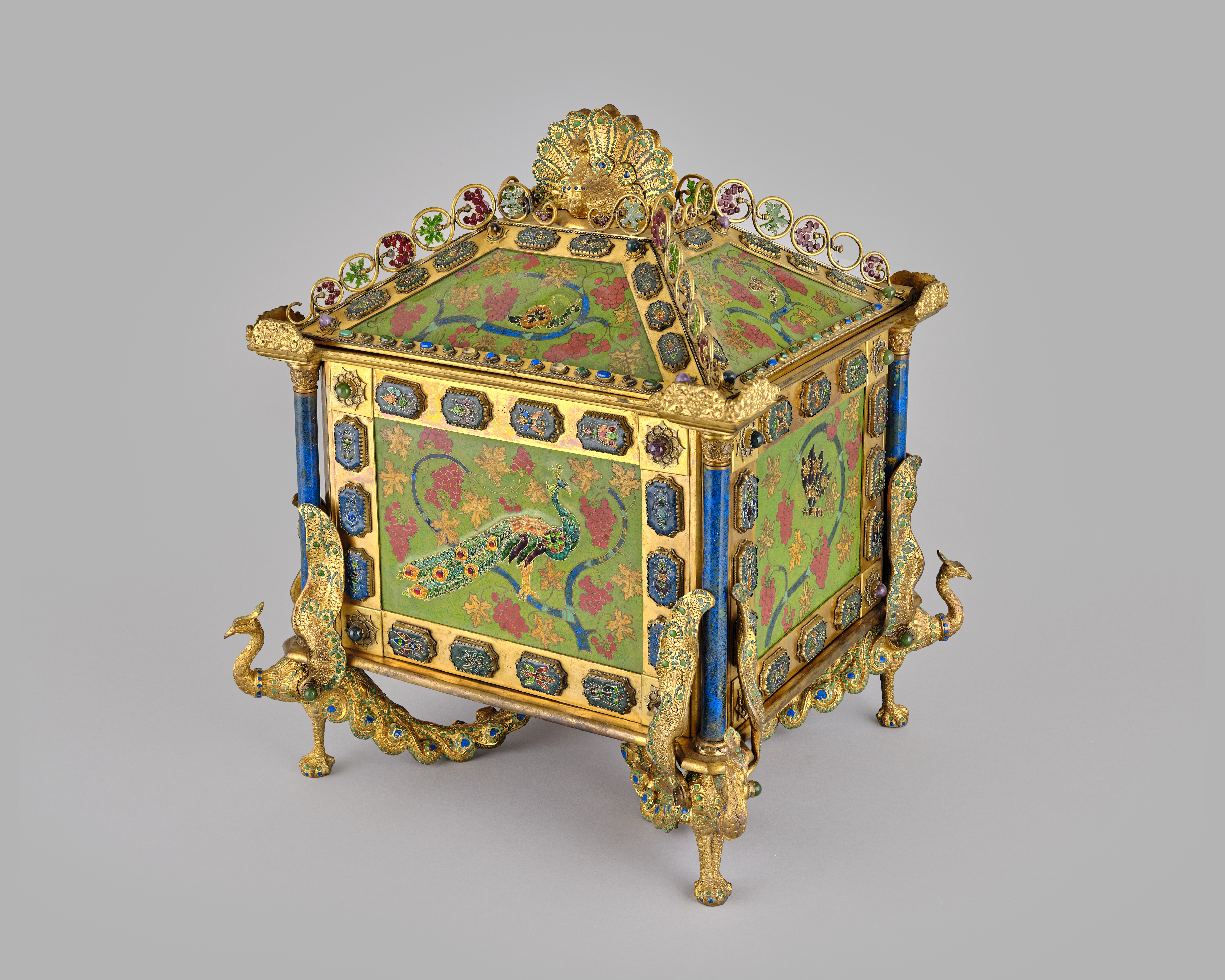 Le paon, symbole d’immortalité, et les grappes de raisins, qui font allusion à la Passion du Christ et à l’Eucharistie, sont deux motifs empruntés à l’art paléochrétien. La richesse de la couleur qui joue sur les accords de rouges et de verts, l’élégance des lignes en forme d’arabesques font de ce coffret un des plus brillants exemples de l’ « art décoratif symboliste ».