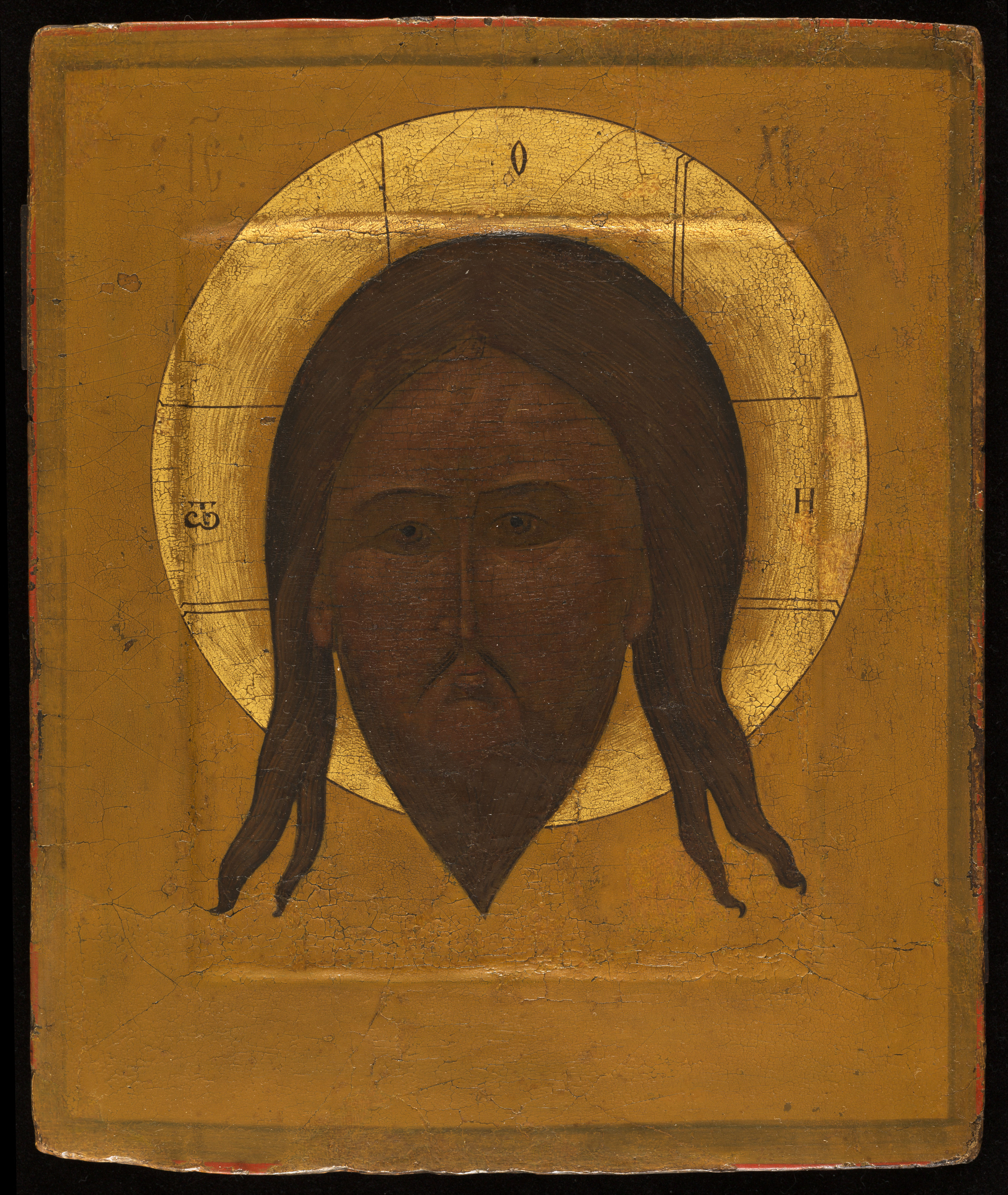Le voile sur lequel s’imprima le visage du Christ n’est pas reproduit ici, mais les traits sont canoniques : front haut, nez droit, longs cheveux ondulés. La barbe lisse se terminant en une seule pointe est typiquement russe et renvoie au type du Sauveur à la barbe mouillée. Il s’agit d’une allusion au fait que le Christ se serait lavé le visage avant d’envoyer son portrait à Abgar. Ce visage du Christ a été réinséré sur une planche de bois plus récente. Cette pratique courante permettait de sauver les parties anciennes des icônes endommagées et d’éviter ainsi la perte d’images saintes.